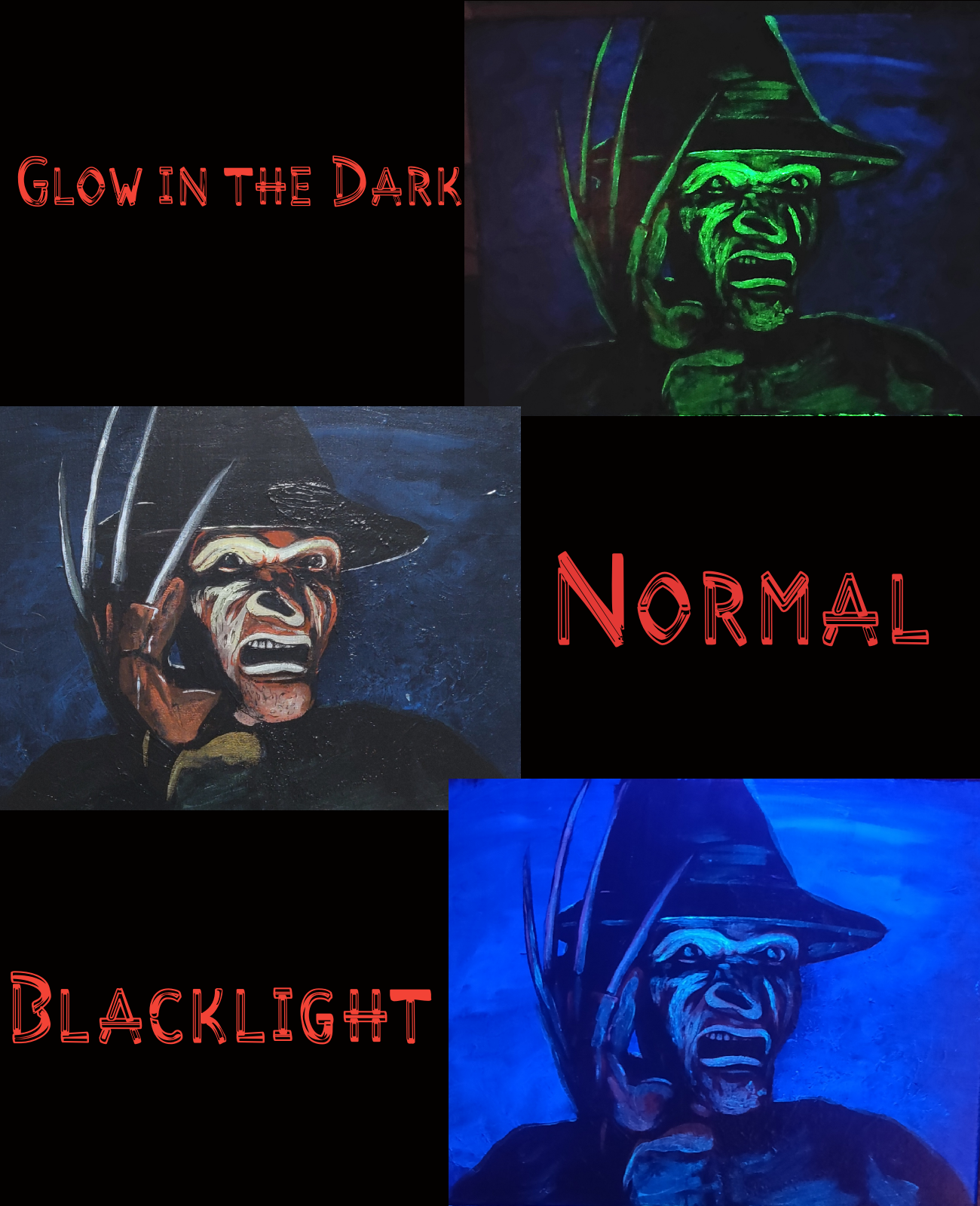 Inspired by the king of our nightmares, Freddy Krueger from the film series Nightmare on Elm Street. Glows in the dark Acrylic on 11×14 canvas. Created by CJ Martinez.